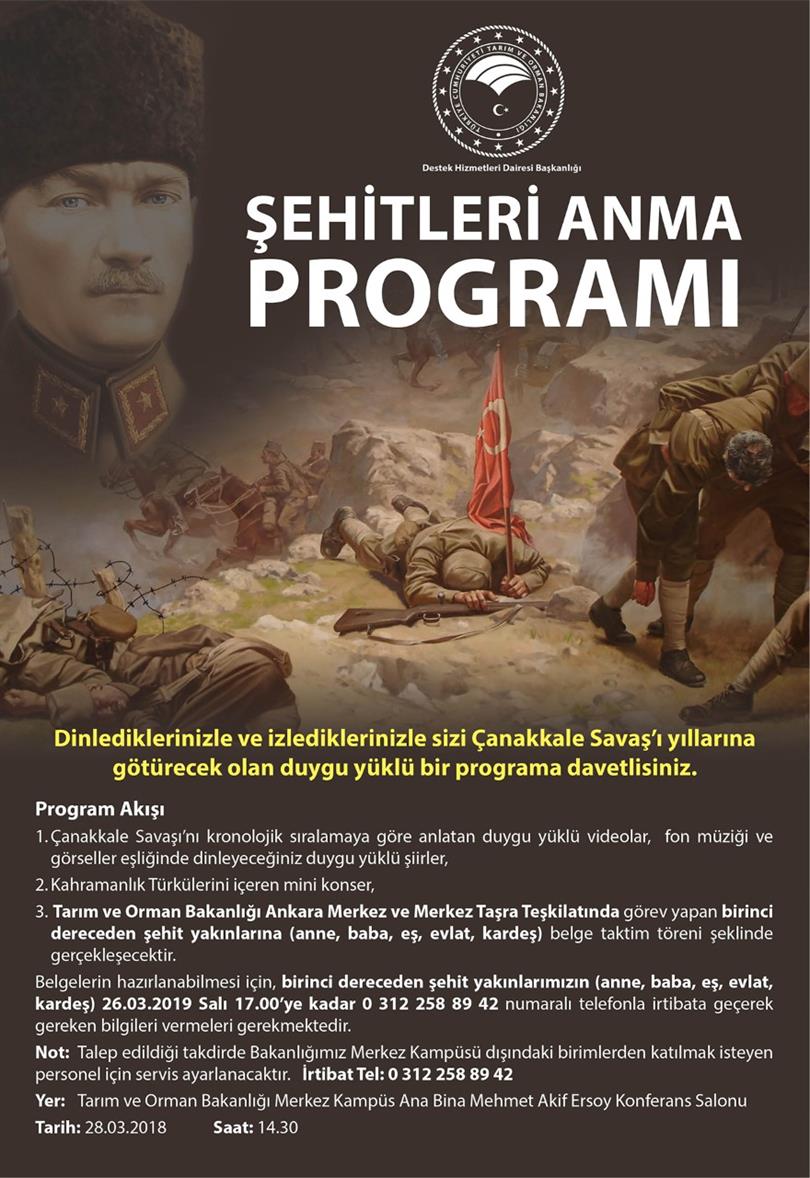 3-Tarım ve Orman Bakanlığı Ankara Merkez ve Merkez Taşra Teşkilatında görev yapan birinci dereceden şehit yakınlarına (anne, baba, eş, evlat, kardeş) belge taktim töreni şeklinde gerçekleşecektir.