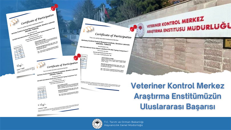 Bakanlığımız bünyesinde faaliyet gösteren Veteriner Kontrol Merkez Araştırma Enstitü Müdürlüğü Genetik Laboratuvarı, Uluslararası Hayvan Genetiği Derneği (ISAG) tarafından düzenlenen At, Sığır ve Koyunlardaki yeterlilik (Comparison Test) testlerinde sonuçların tamamını doğru yaparak Rank:1 seviyesinde yer almaya hak kazanmıştır.