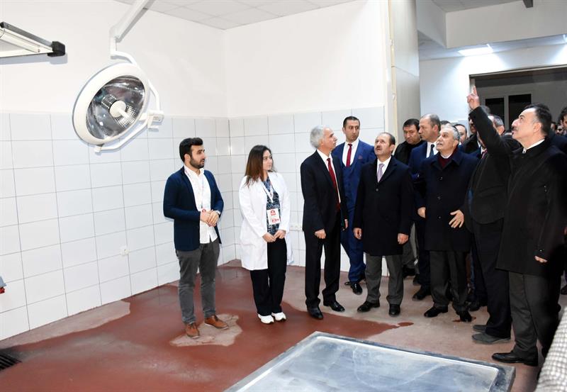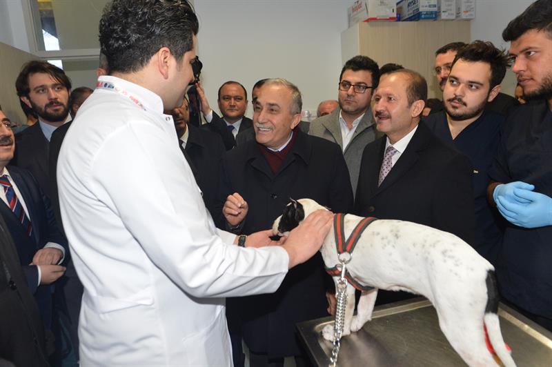 Bakan Fakıbaba ve beraberindekiler, açılış kurdelesini kestikten sonra hastaneyi gezerek, Veteriner Fakültesi Dekanı Prof. Dr. Mehmet Başalan'dan bilgi aldı.