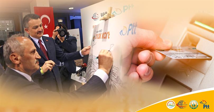 Tarım ve Orman Bakanı Dr. Bekir Pakdemirli ile Ulaştırma ve Altyapı Bakanı Cahit Turhan bugün Tarım Kart için PTT ile Türkiye Tarım Kredi Kooperatifleri arasında iş birliği yapılması amacıyla düzenlenen imza törenine katıldı.