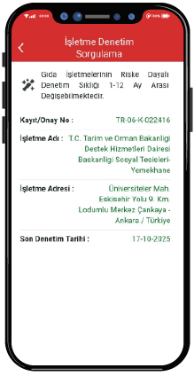 4. Sorgulama sonucunda söz konusu işletmenin; ünvan, adres, kayıt/onay numarası ve işletmeye yapılan en son denetim tarihi verilerine ulaşılır.