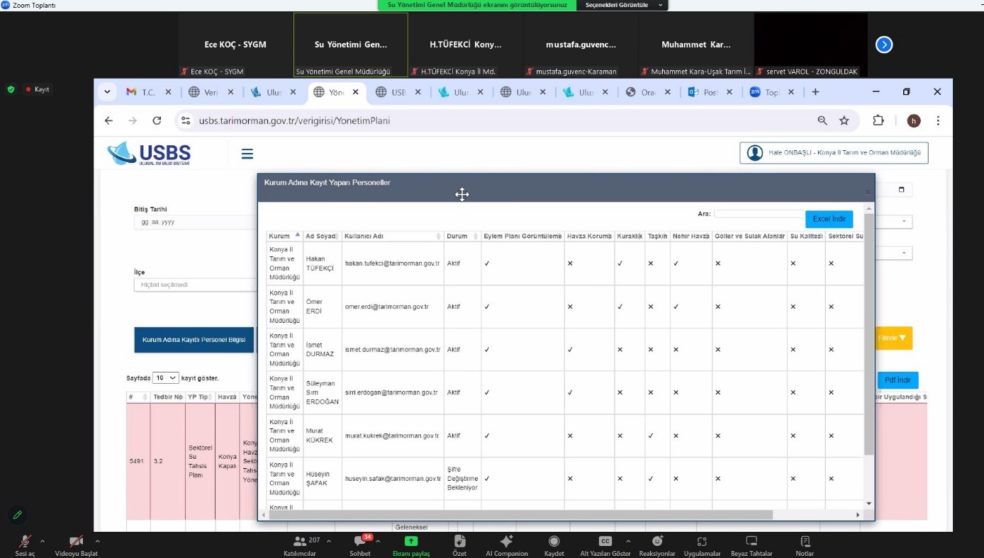 Eğtimde, Nehir Havza Yönetim, Sektörel Su Tahsisi Yönetim, Kuraklık Yönetim ve Taşkın Yönetim Planı özelinde tedbirlerin belirlenmesi, uygulanması, takibi ve değerlendirilmesi konusunda katılımcılar bilgilendirildi. Canlı uygulama üzerinden USBS modülleri tanıtıldıktan sonra; yetkili personelin sorumlulukları kapsamında, USBS Veri Giriş Modülü üzerinden yürüteceği çalışmalara ilişkin (kullanıcı tanımı, tedbire çalışma ekleme, güncelleme gibi) uygulamalı bilgilendirme yapıldı.