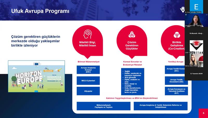 Etkinliğe Genel Müdürümüz Sayın Dr. Mustafa Altuğ Atalay başkanlık etmiştir. Program kapsamında TÜBİTAK AB Çerçeve Programlar Müdürü Sayın Çağrı Yıldırım ile Ulusal İrtibat Noktaları Sayın Çınar Adalı Öner, Sayın Merve Polat ve Sayın Meltem Ünlü Tokcaer tarafından Küme 6 çağrılarının kapsamı, başvuru süreçleri ve proje hazırlama aşamalarına ilişkin kapsamlı sunumlar gerçekleştirilmiştir.